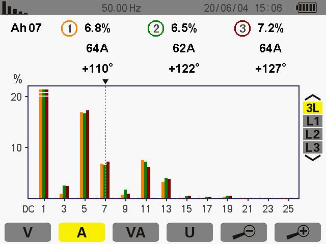 此次測(cè)量為7次諧波其ABC的THD值為 6.8% 6.5% 7.2%諧波電流為 64A 62A 64A。