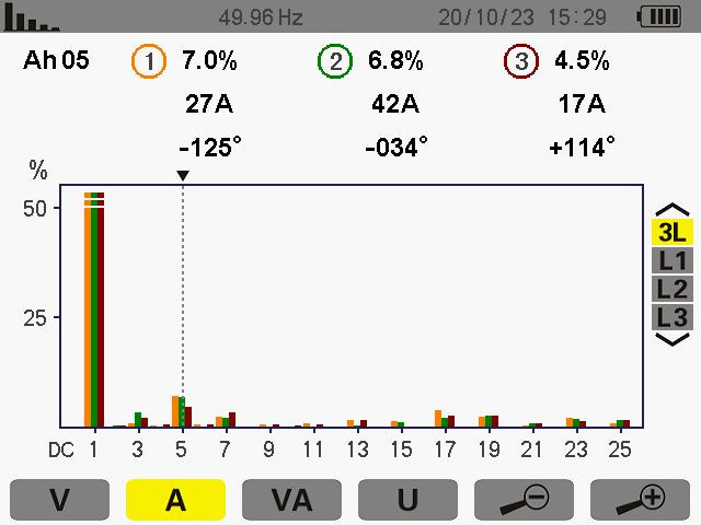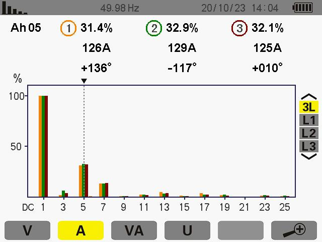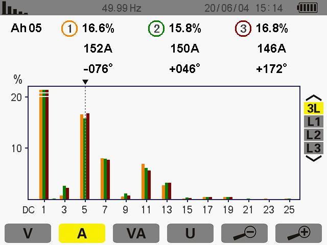 此次測(cè)量為5次諧波其ABC的THD值為 16.9% 16.8% 17.4%諧波電流為 156A 156A 151A。