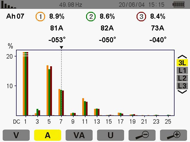 此次測(cè)量為7次諧波其 ABC 的 THD 值為 8.9% 8.6% 8.4%諧波電流為 81A 82A 73A
