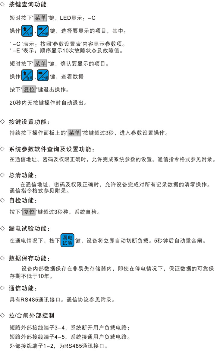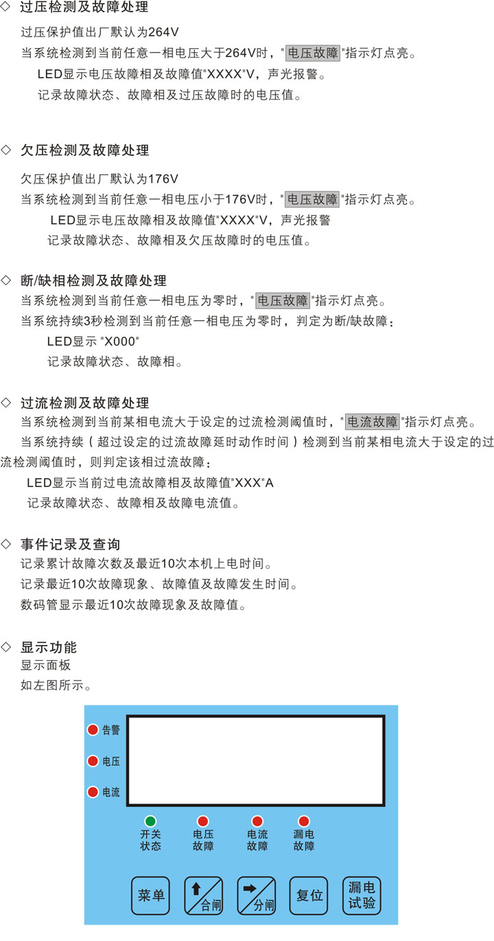 ◇ 多功能保護(hù)功能:具有漏電、過壓、欠壓、過流、短路等多種保護(hù)。
