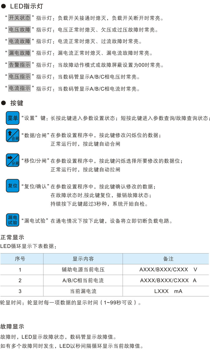 ◇ 自動重合閘:漏電、過壓、欠壓故障恢復(fù)后可自動重合閘。